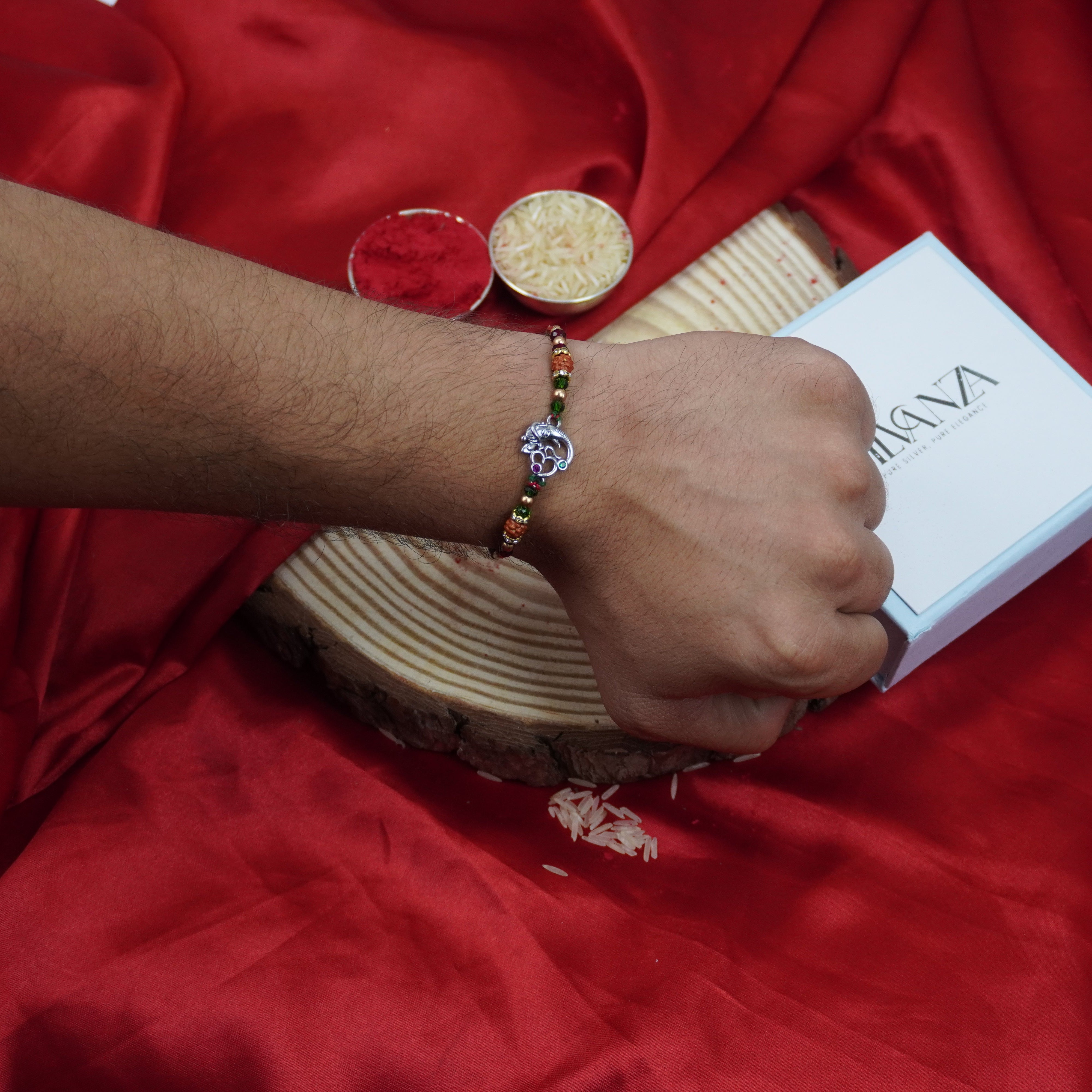 A perfect blend of earth tones and divine energy, the Bappa’s Blessing Rakhi features a rustic Ganesha charm surrounded by traditional Rudraksha beads and golden highlights — ideal for grounded yet modern brothers.