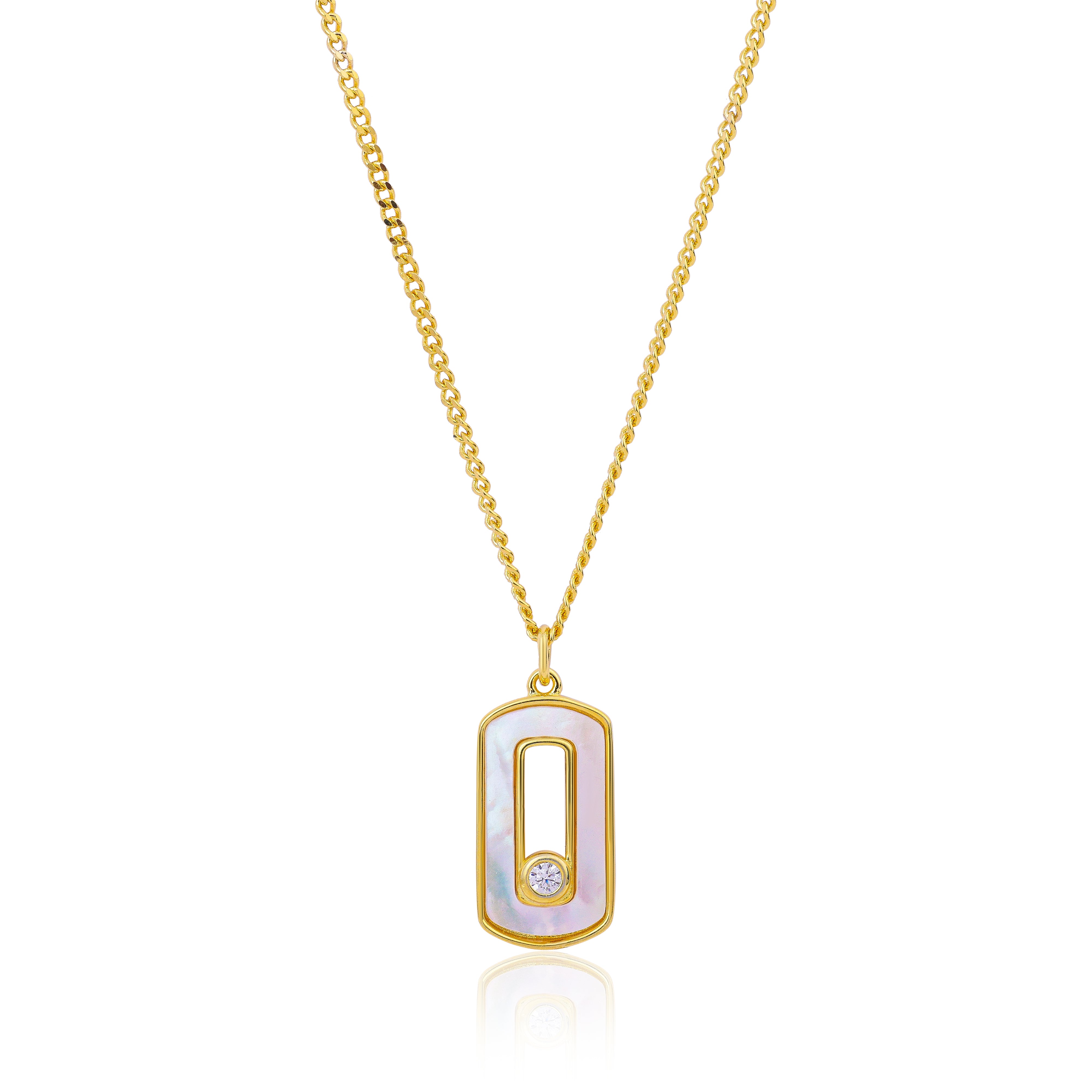 This golden pendant features a teardrop circular motif adorned with zirconia.