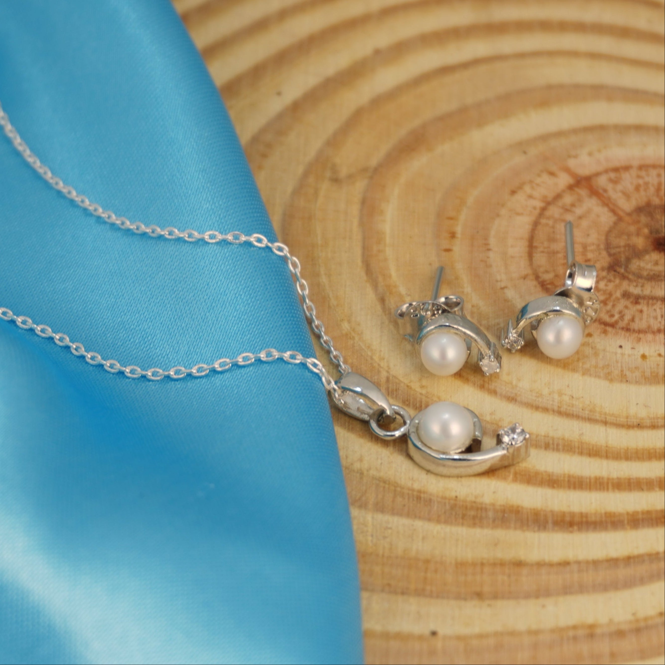 necklace and earrings feature a soft white pearl nestled in a graceful silver