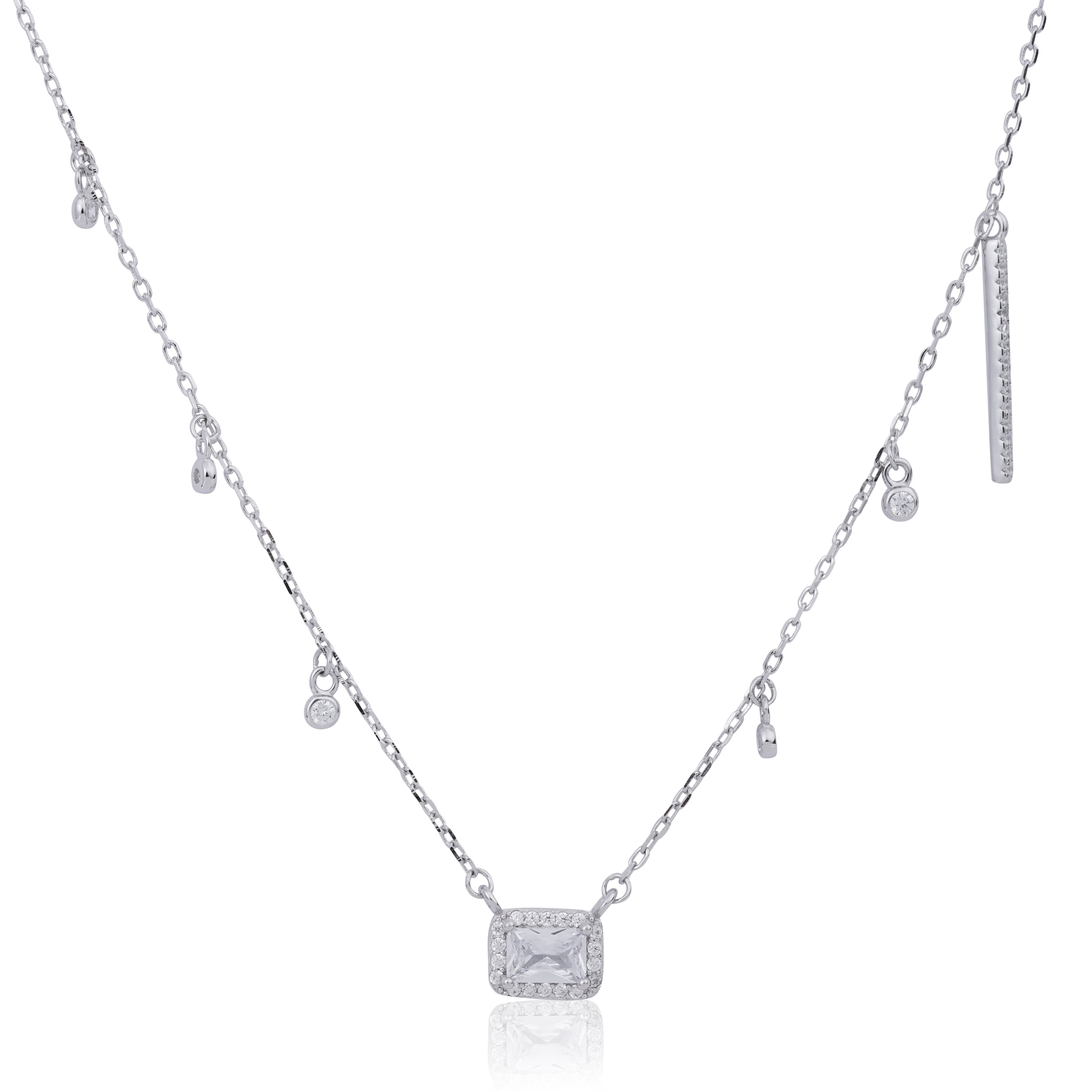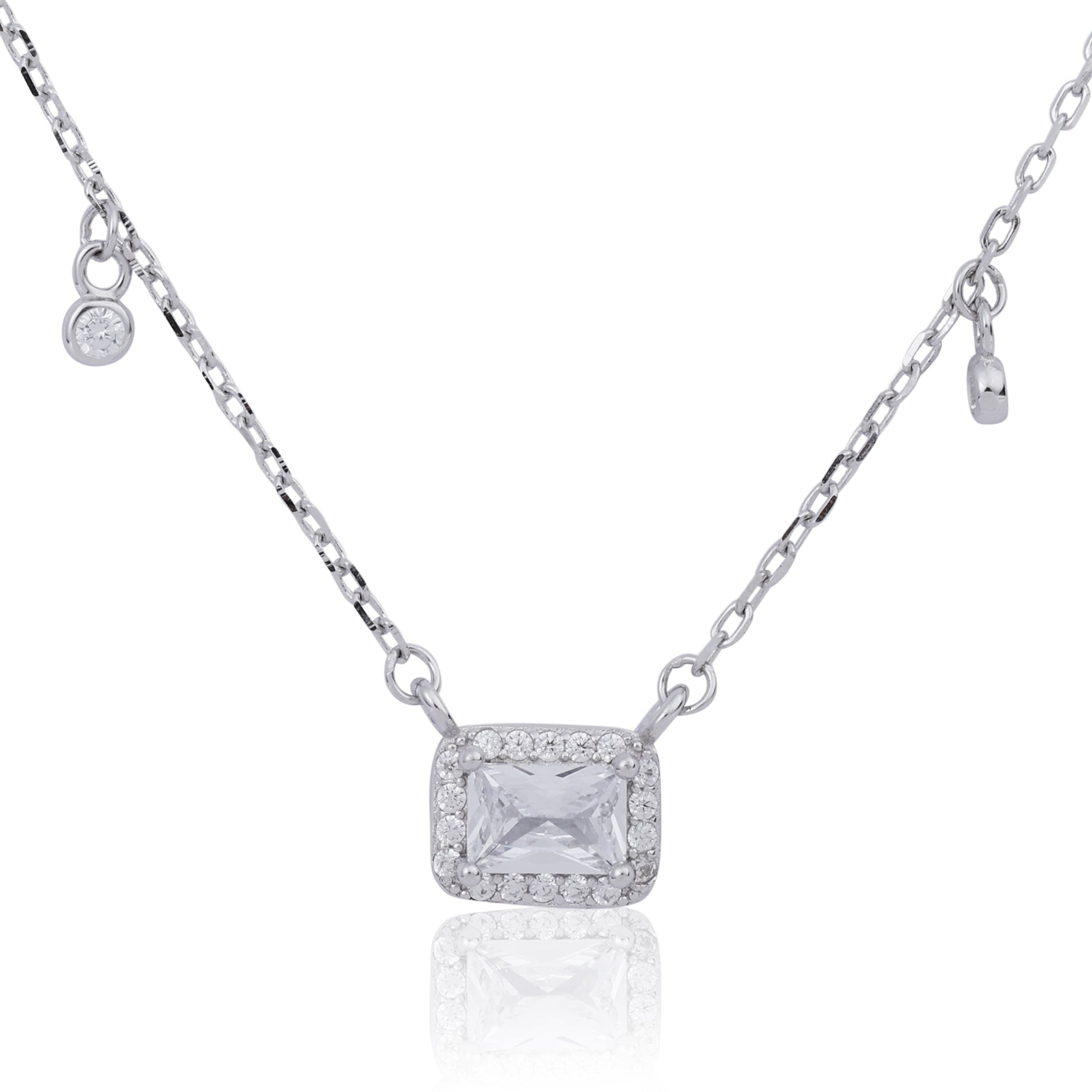This sliver pendant with a link chain has a rectangular zirconia set with small circular motifs around the chain.