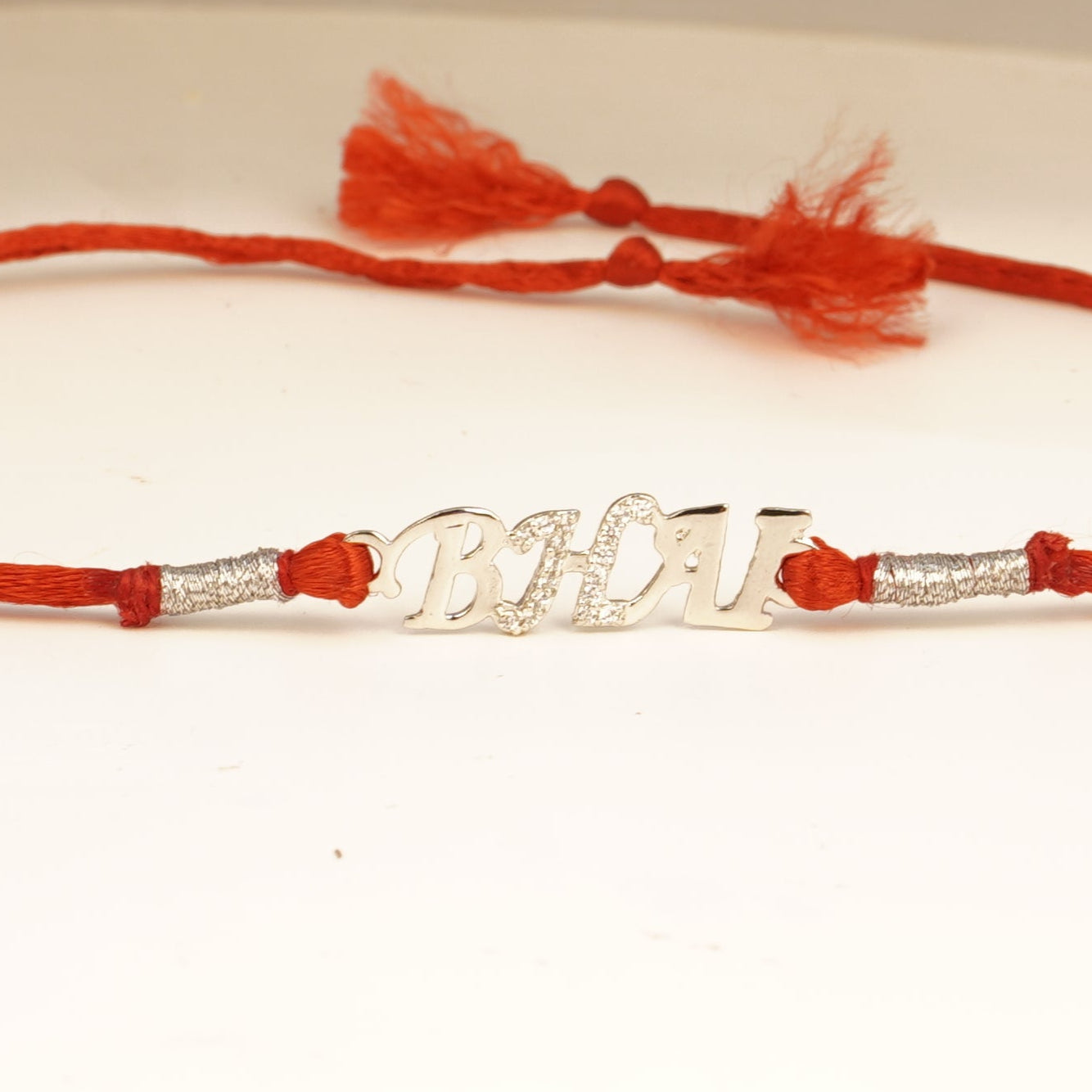 stylish “Bhai” rakhi featuring sparkling silver-toned letters on a vibrant