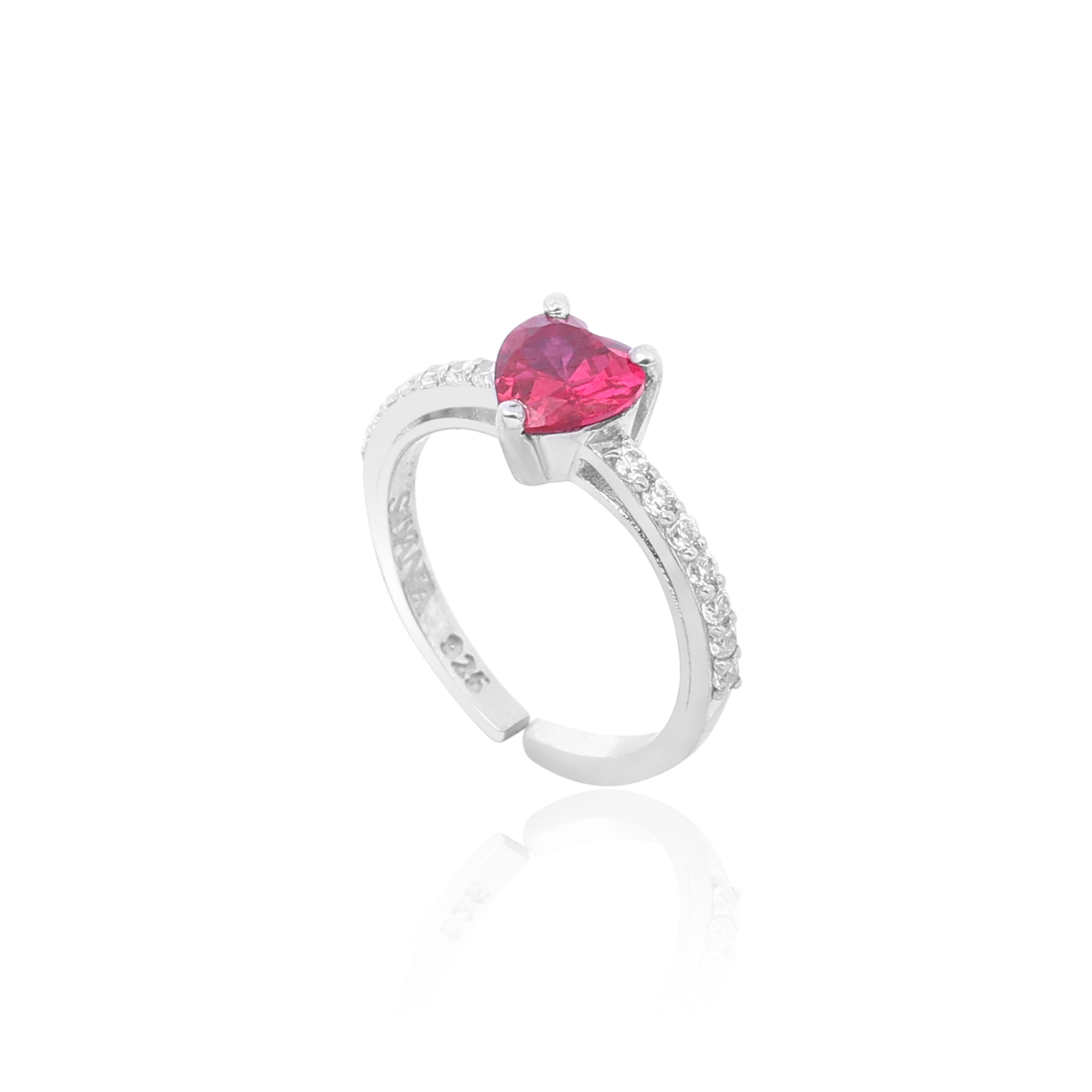 This Affordable Silver Engagement Ring features a heart motif with a red-colored stone at the center.