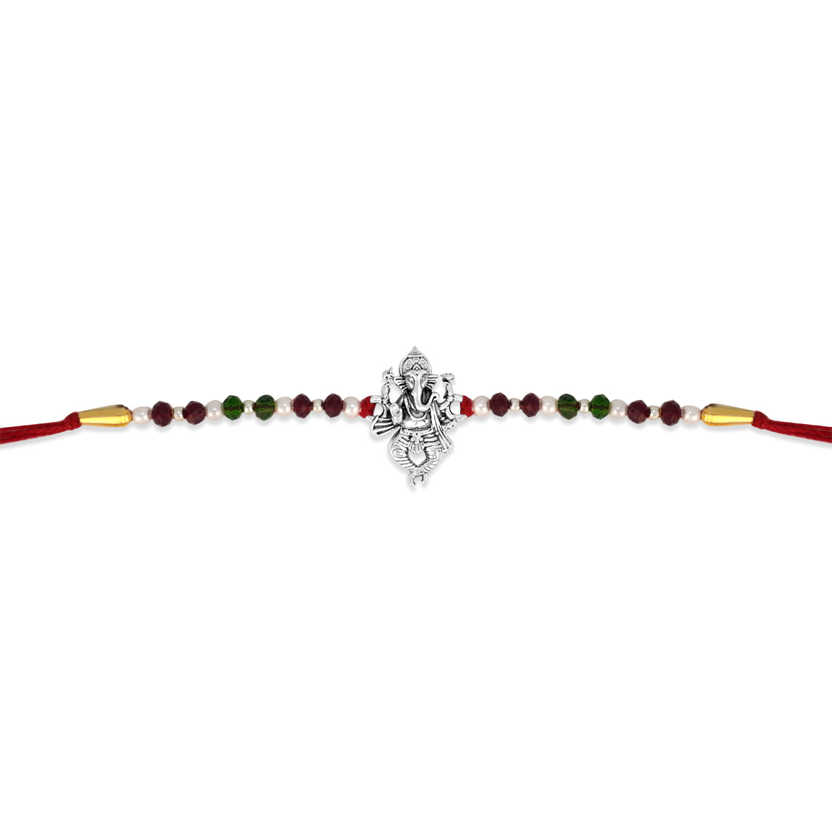 This Raksha Bandhan, tie a thread that carries tradition and style. The Shree Vighnaharta Rakhi features a silver-tone Ganesha centerpiece with sparkling red and green beads, adding a festive touch to your brother’s wrist and soul.