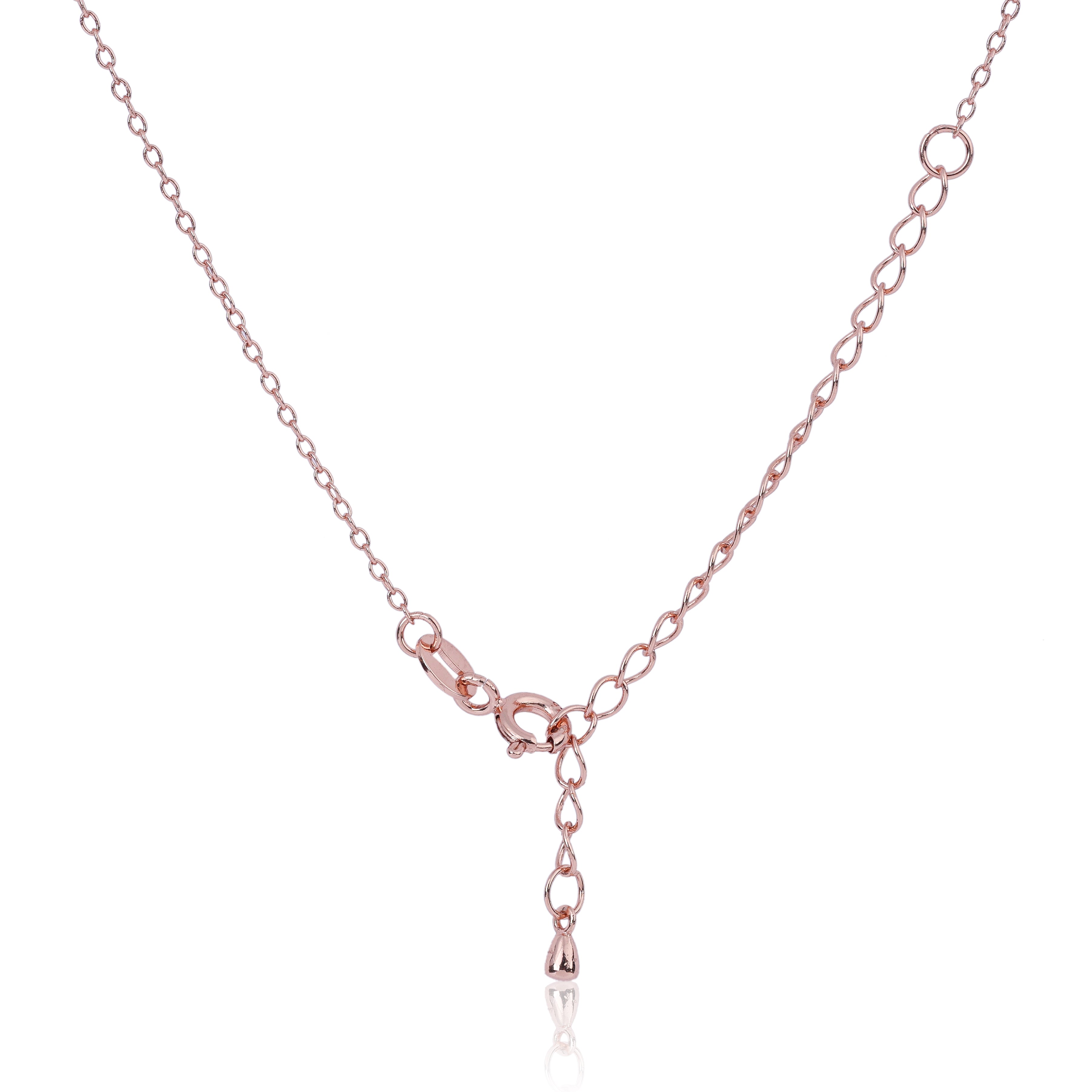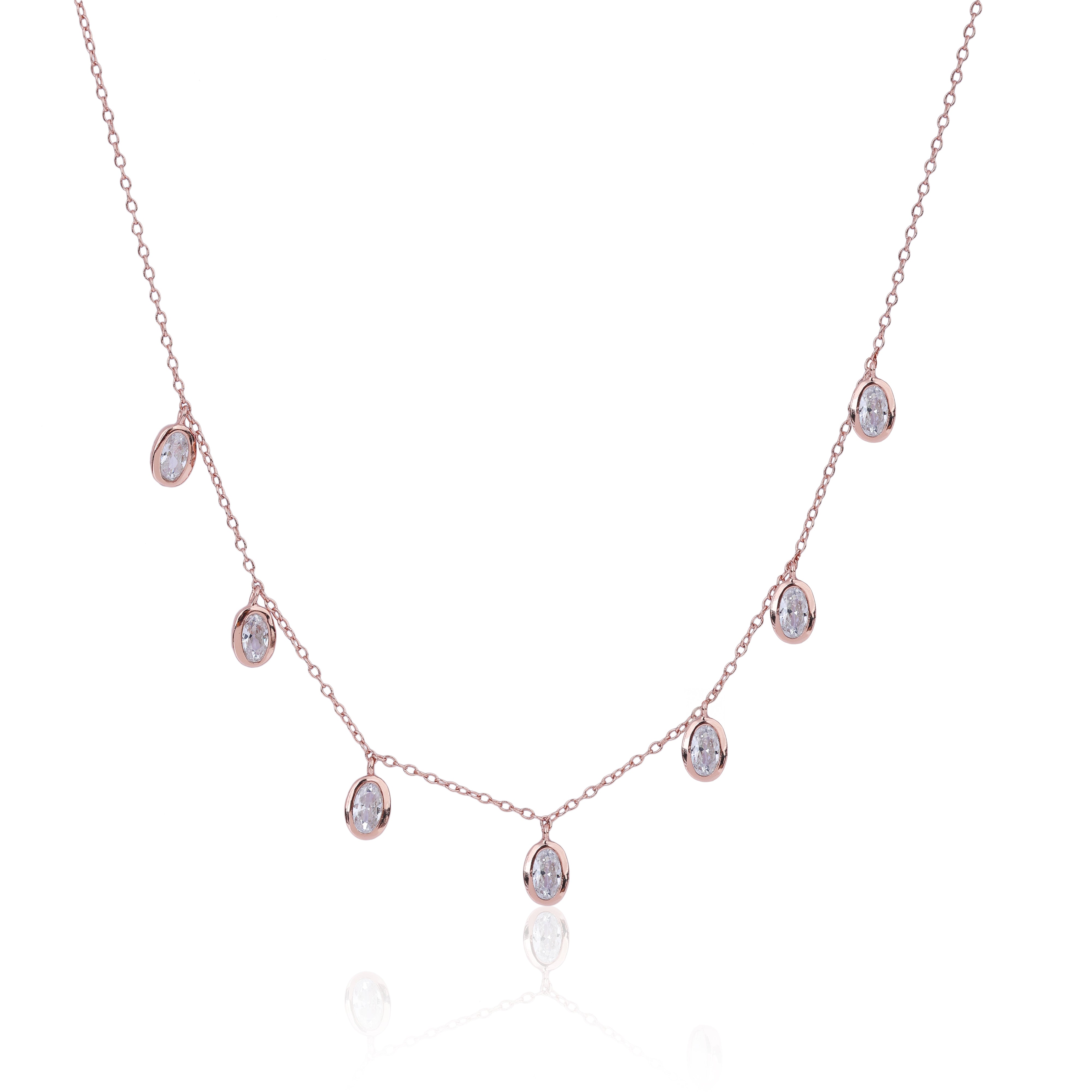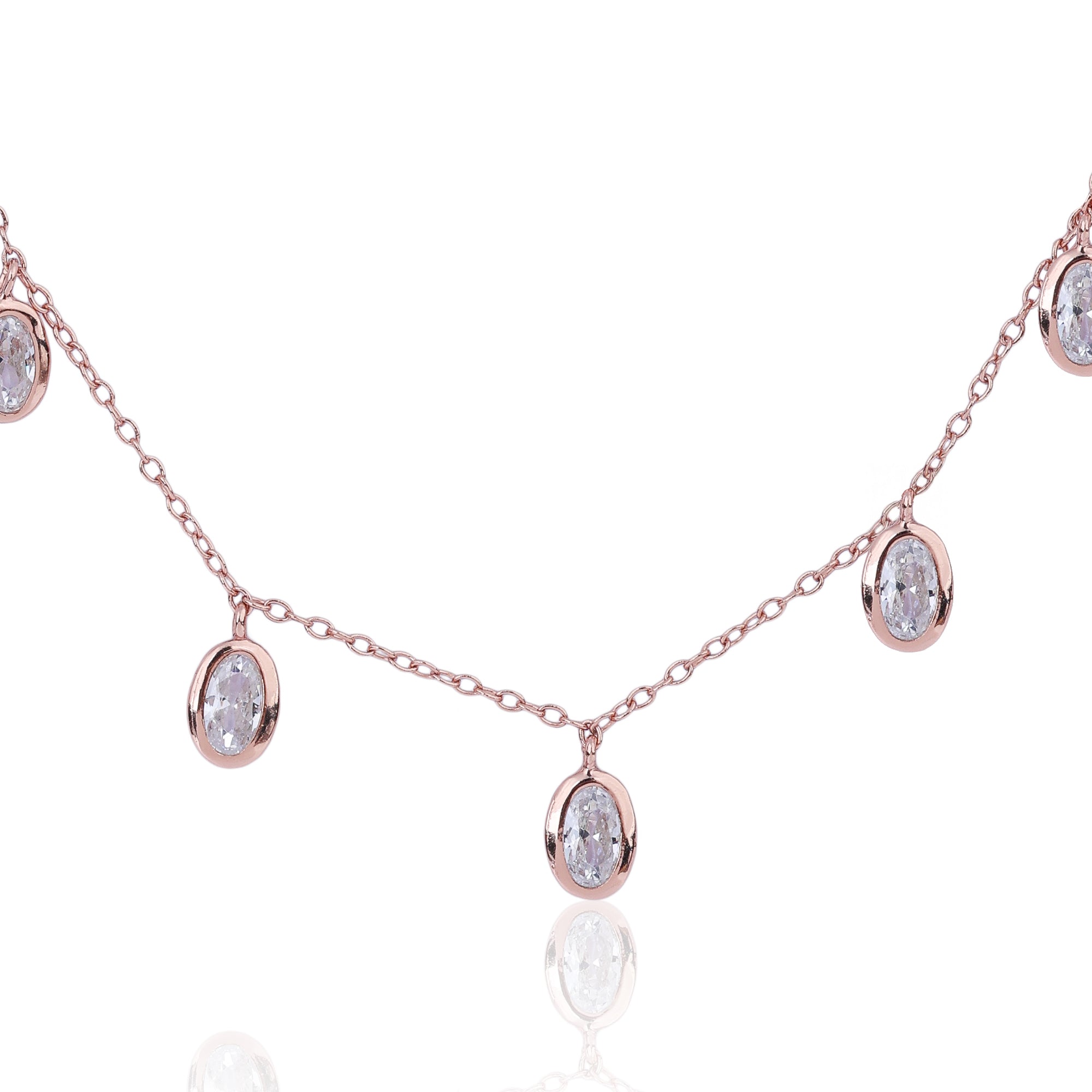 This rose gold necklace has teardrop zirconia charms spaced throughout the chain length.